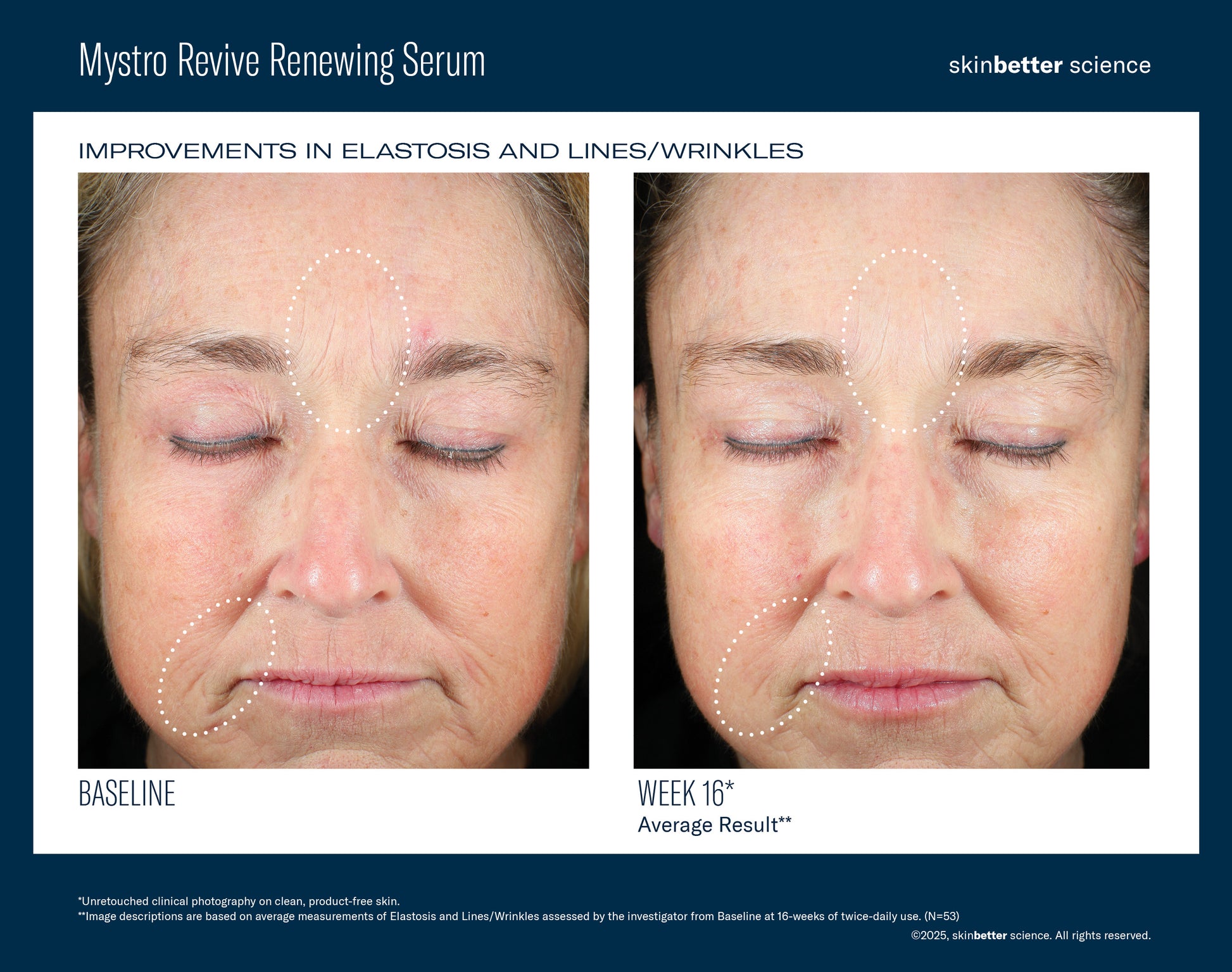 Mystro Revive Renewing Serum rejuvenates the look of skin affected by hormonal decline associated with perimenopause and menopause. Formulated with P.A.T.H.[13] and reenergizing TAP biotechnologies, this nourishing serum targets the visible skin effects of hormonal changes—dryness, dullness, loss of elasticity, and the appearance of lines and wrinkles—to revive, rebalance, and restore skin’s natural luminosity and youthful appearance.